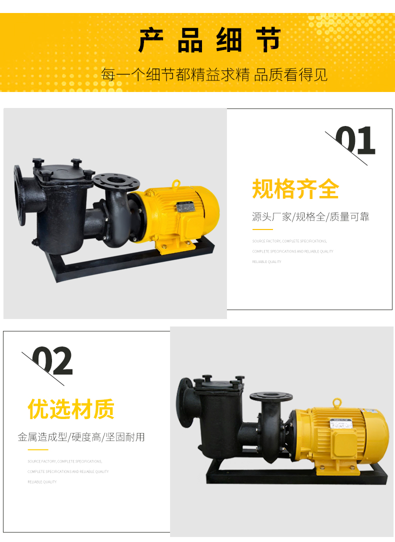 - 根据水力学原理设计的泵体,用金属造成型,坚固的一体式结构,经久耐用。滤篮容量大,大大减少了清洗工作。性能好,效率高,加快了注水(灌溉)速度并提高了能源效率。适用于各种泳池、工业用水、海洋馆、水上乐园等。