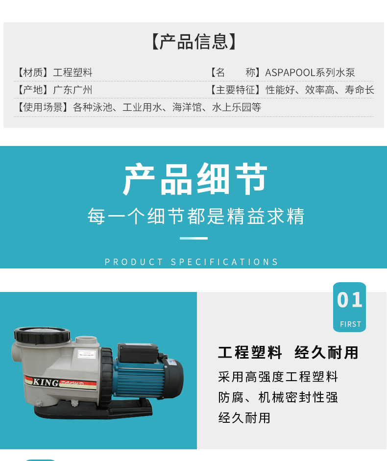 根据水力学原理设计的泵体,泵体、叶轮采用高强度工程塑料,经久耐用。滤蓝容量大,大大减少了清洗工作。性能好,效率高,加快了注水(灌溉)速度并提高了能源效率。适用于各种泳池、工业用水、海洋馆、水上乐园等。