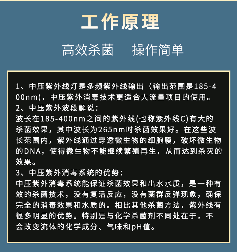中压紫外线杀菌系统的中压紫外灯输出波长的范围较宽,对细菌和病毒可以起到杀灭效果,能够灭活抗氯性微生物组织,列如大肠杆菌,隐孢子虫,阿米巴虫和细菌等。在消毒过程中不会产生有毒物和有害副产品,安全环保。
