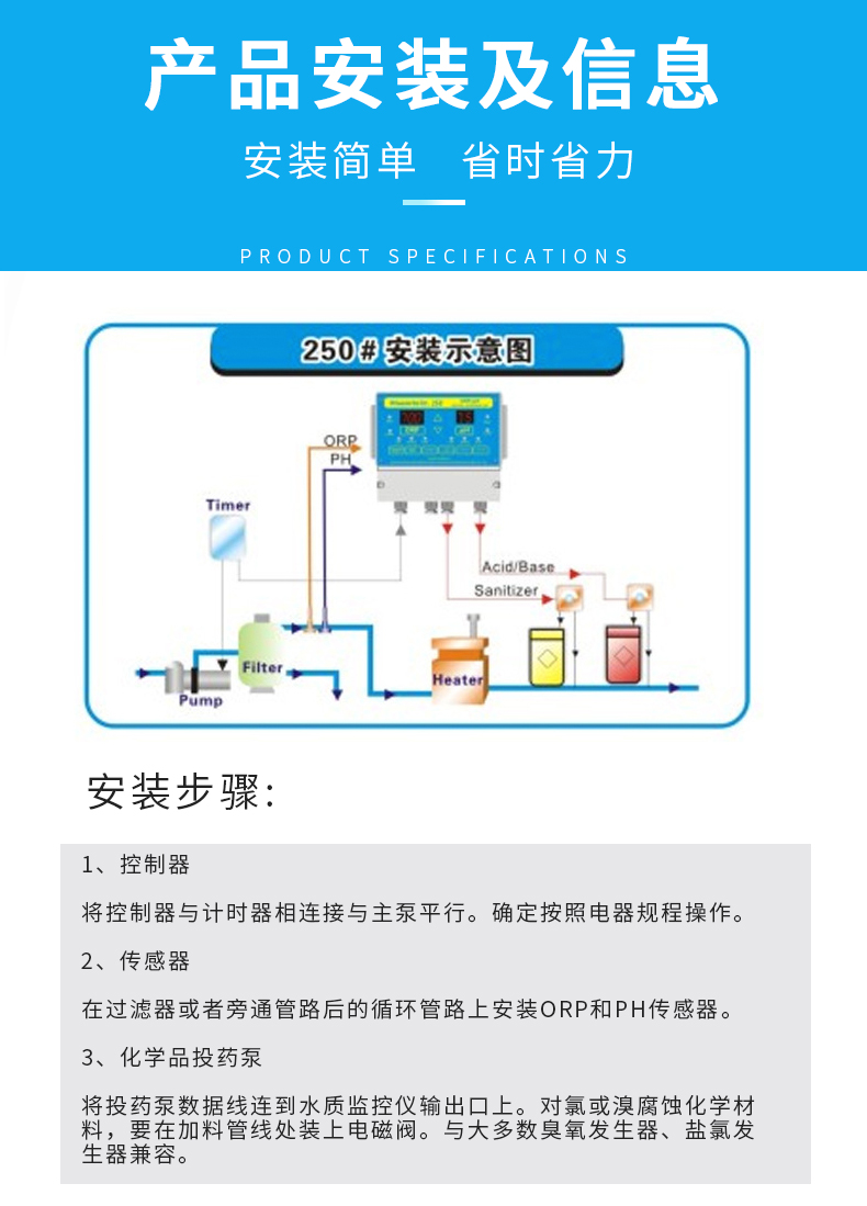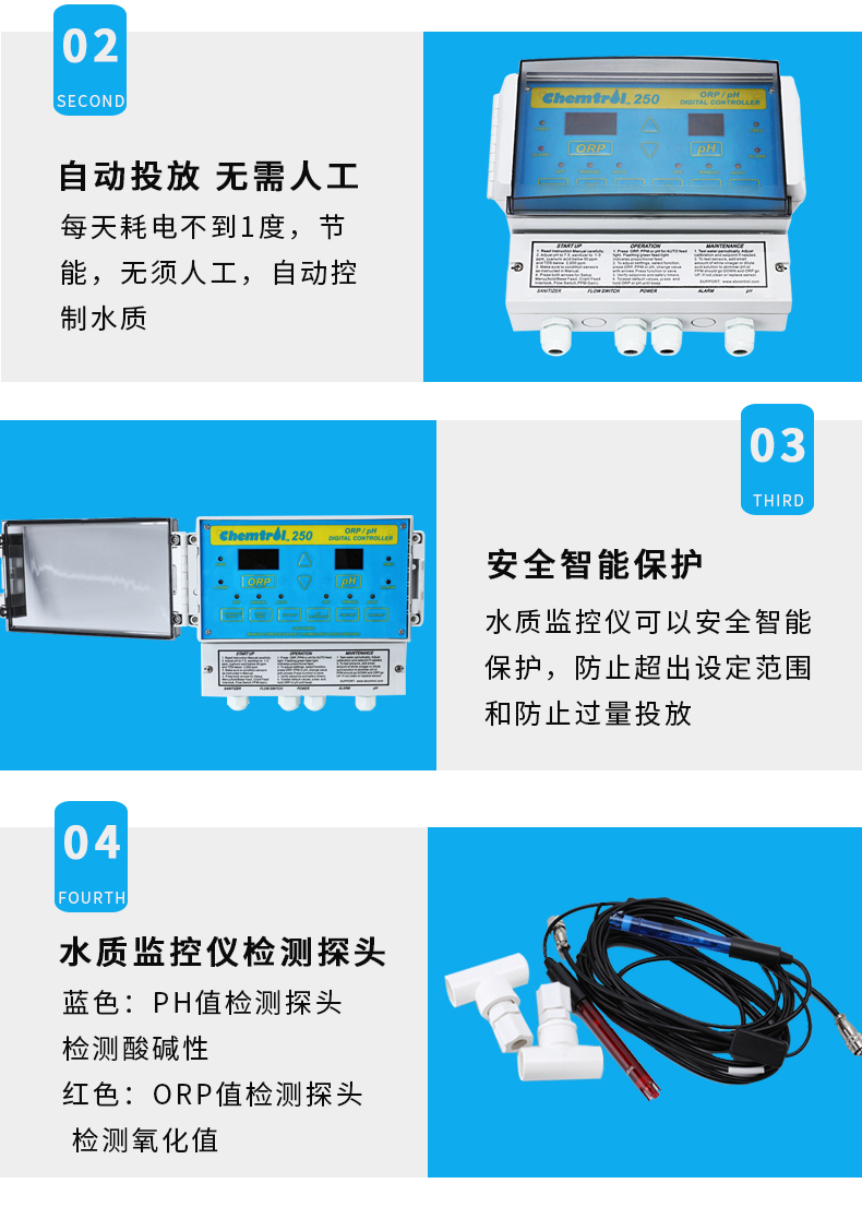 人工投药药量不稳定,含氯/溴不足,细菌,藻类容易滋生。使用全自动监控仪,每天耗电不到1度,无需人工,自动控制水质,商家游泳池理想匹配产品。