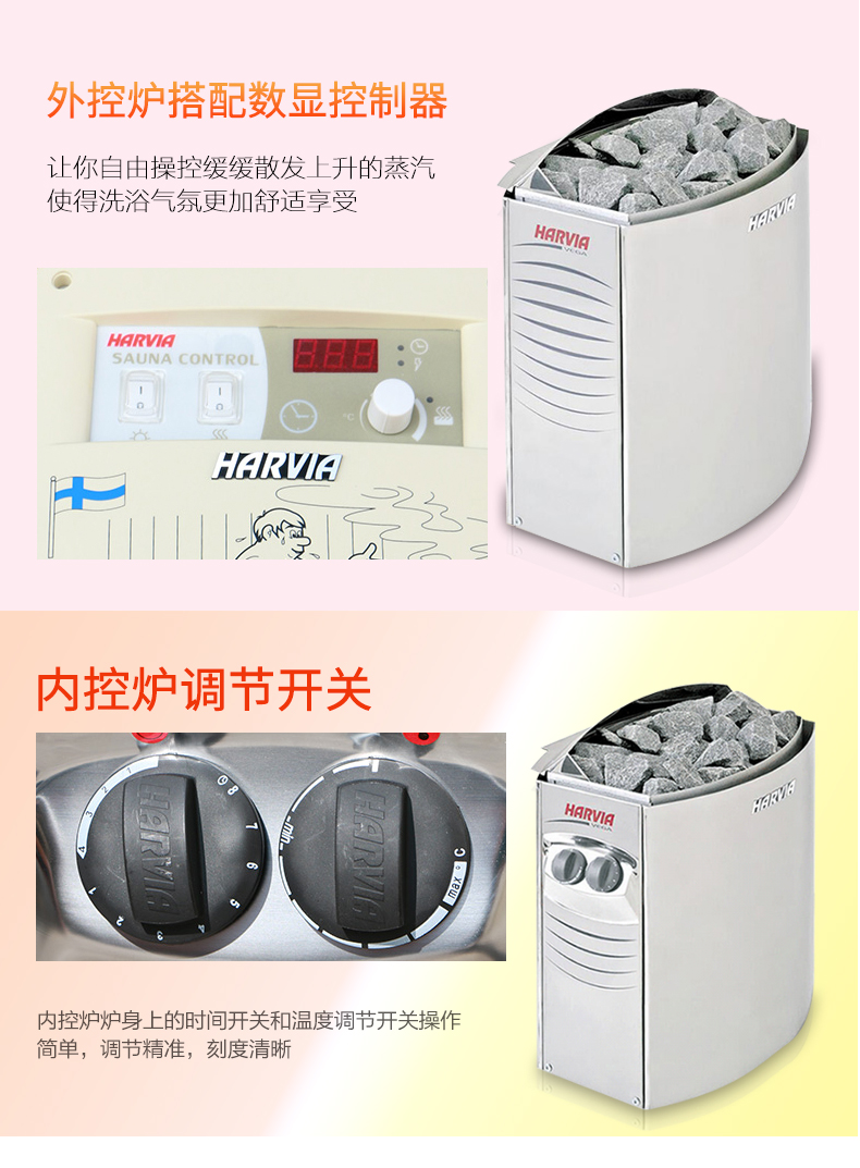 桑拿炉,其实就是一种利用石头加热,来让室内温度上升的设备,有干蒸和湿蒸两大种类,在桑拿炉的室内待上一会就有大汗淋漓、酣畅不已的感受,有祛湿等保健作用。桑拿炉,其实就是一种利用石头加热,来让室内温度上升的设备,有干蒸和湿蒸两大种类,在桑拿炉的室内待上一会就有大汗淋漓、酣畅不已的感受,有祛湿等保健作用。HARVIA桑拿炉是芬兰的品牌,于1950年创立,原本是Tapani Harvia先生为自己家人的健康着想而创建的,后逐步发展成为行业内知名的桑拿炉品牌,其产品的种类比较多,像桑拿炉、桑拿房、蒸汽机、红外光波房等等。哈维亚品牌有着给世界每个角落里的人带来宁静、舒适的享受。