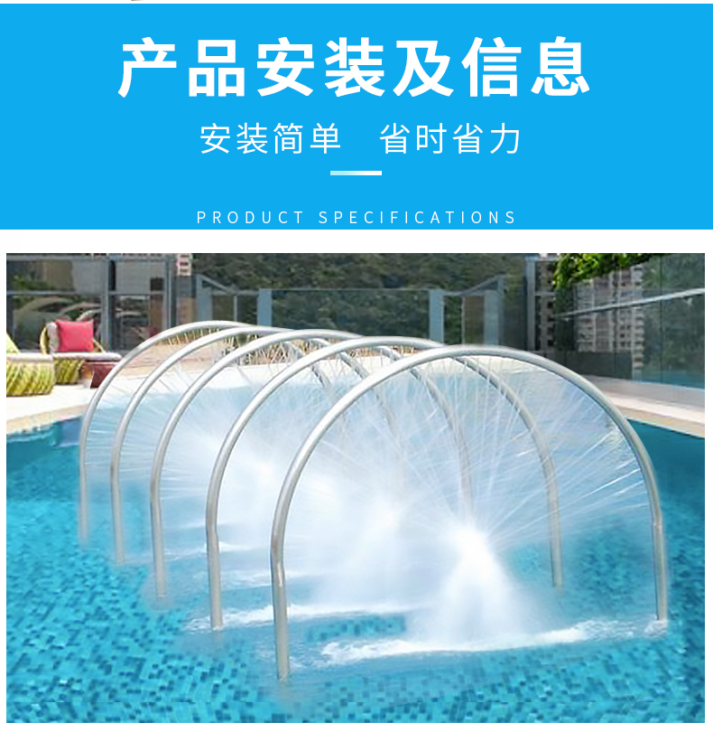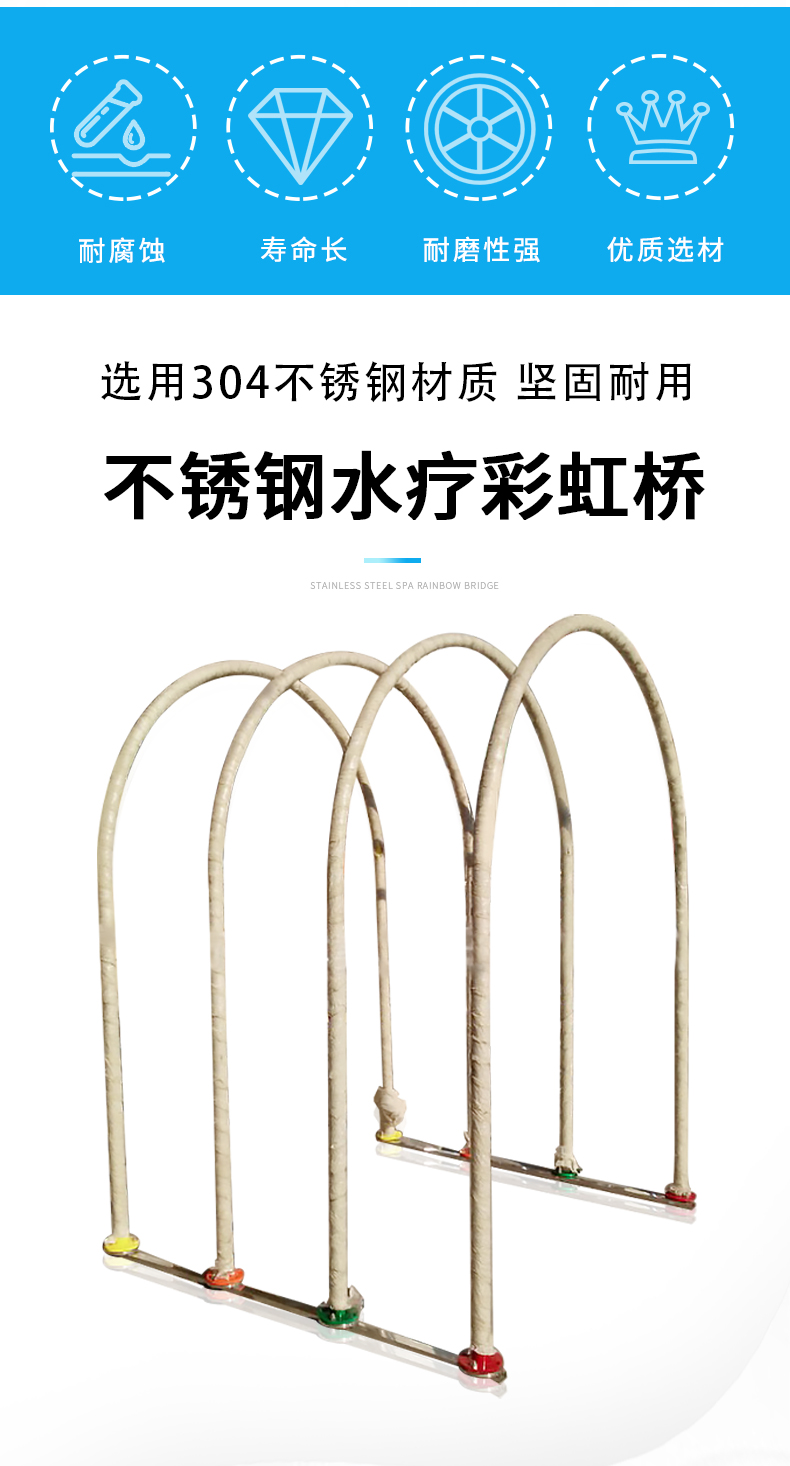 不锈钢水疗彩虹桥利用四周立柱喷射出的强力扁型水膜加上顶部水流冲击而下,按摩身体各个部位,能起到消除疲劳、疏通经络,使全身肌肉得到放松改善循环,促进新陈代谢。